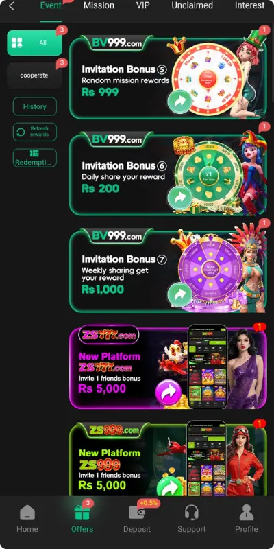 One major point why BV999 application has a significant user base is the both the number and the variety of bonuses and rewards that the platform offers. For example: