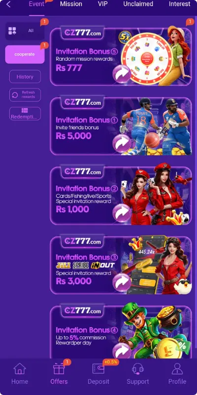 CZ777 platform offers different types of bonuses and rewards to keep players engaged and motivated. Below is a short and simple explanation of each bonus type: