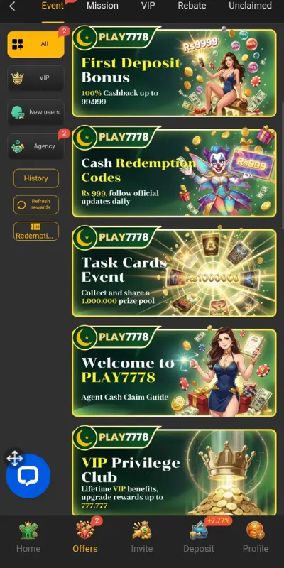 Besides, the app facilitates the user’s awareness of earning options and cash rewards are clearly displayed, allowing the users to quickly discover the opportunities that are available to them. On the home screen, you will see a “big win chance” section which is broken down into large blocks. The player’s path to finding their earning chances is made quite straightforward by this. Also, the combination of plain icons, a contemporary interface, and seamless navigation contribute to making the Play7778 a very comfortable platform for usage.