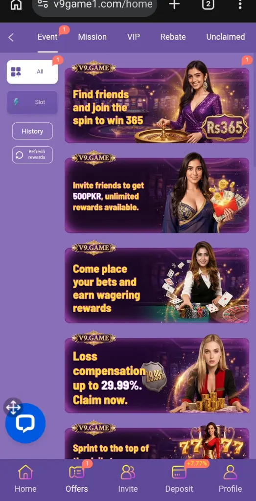 Promotional offers play an important role in enhancing user engagement. V9 plateform provides several types of bonuses designed to reward both new and existing players.